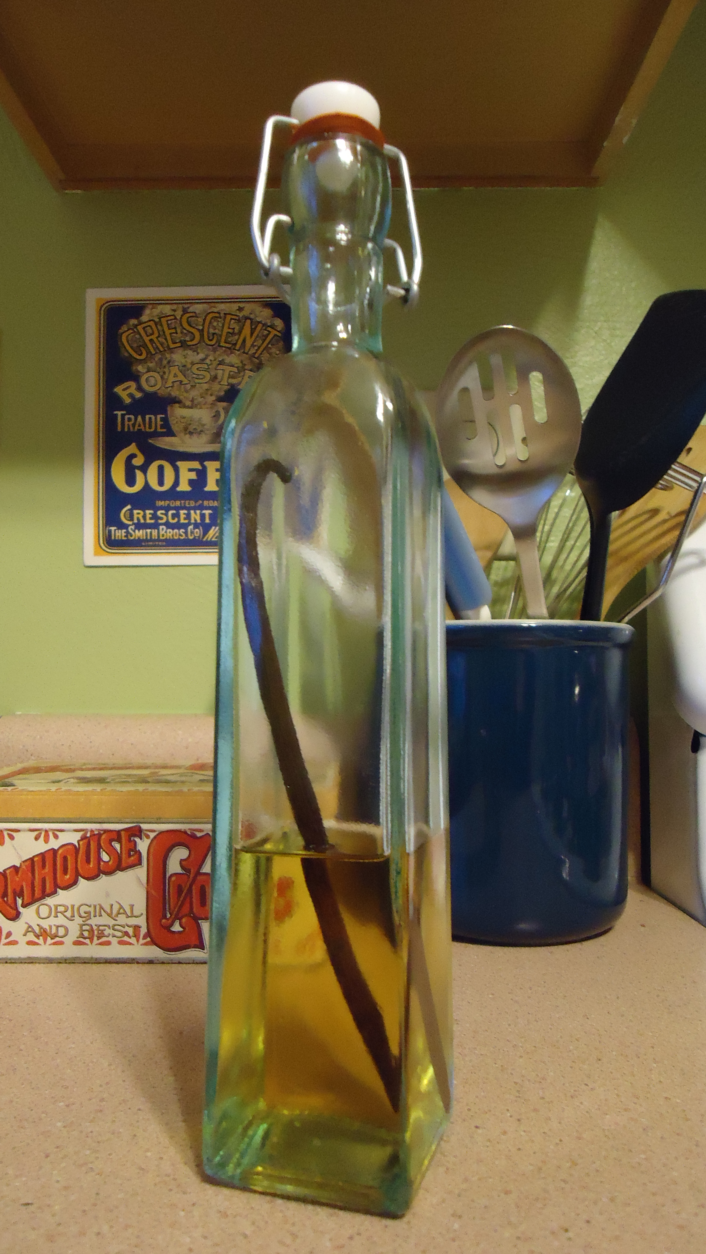 On a weekend getaway to Williamsburg, Virginia, I spotted vanilla beans at the Raleigh Tavern Bakery. On the packaging was a recipe for homemade vanilla extract, and I’ve adapted it as follows; I usually have one bottle in use and another steeping in my cupboard.