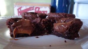 Rolos, according to Mike, are like crack. And I have to agree; there’s something about that smooth chocolate/caramel combination that is highly addictive. Because I’m a big fan of the Reese’s peanut butter cup cookie, which involves peanut butter cookie dough baked in a mini muffin tin and a miniature peanut butter cup pressed into its center, I was excited to try this recipe.