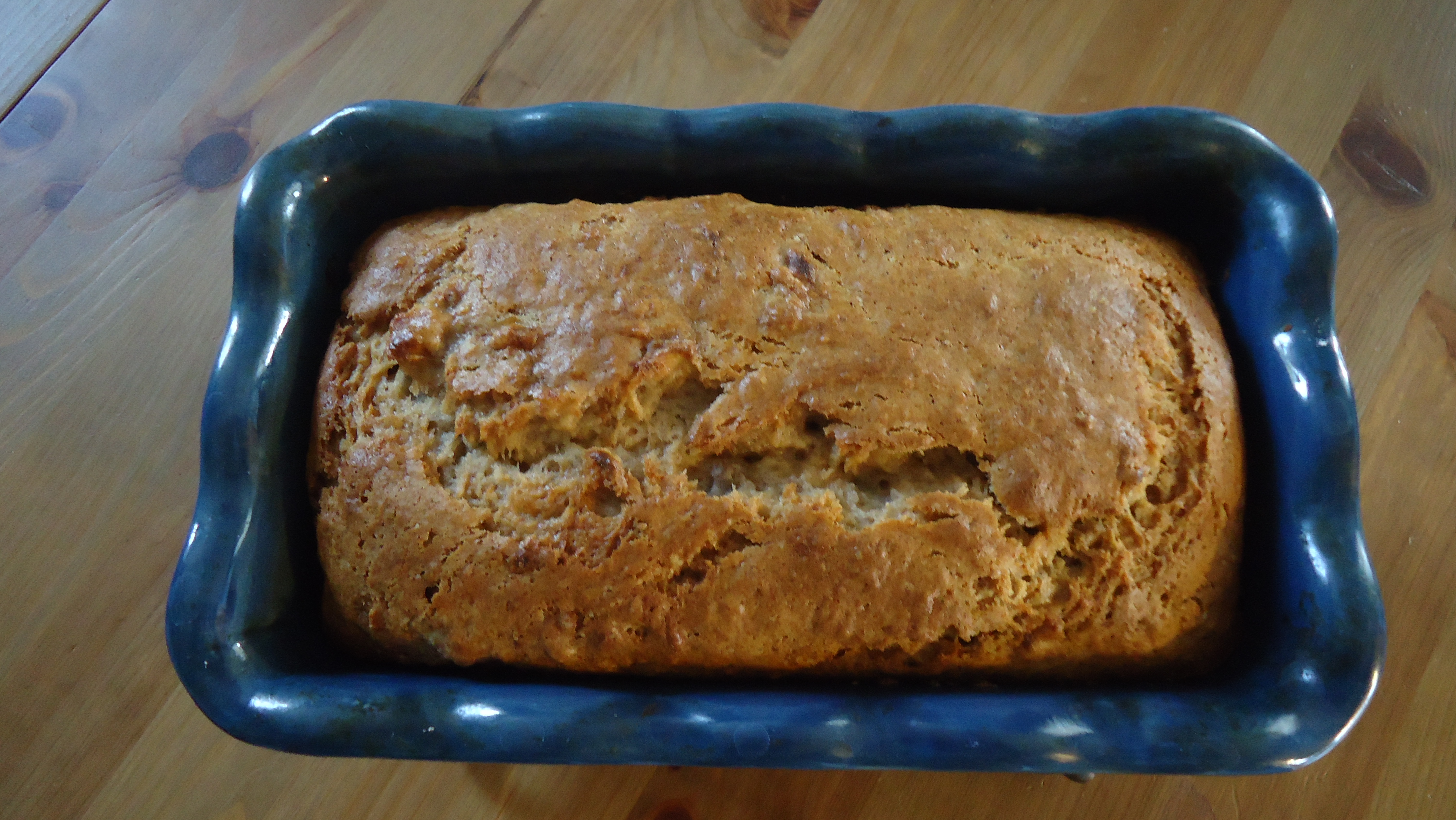 Pour into loaf pan and bake for about 50 minutes, until a cake tester comes out clean; check the bread at about 40 minutes to make sure the top isn’t browning too quickly; if it is, make a tent of aluminum foil and cover the bread until it is through baking.