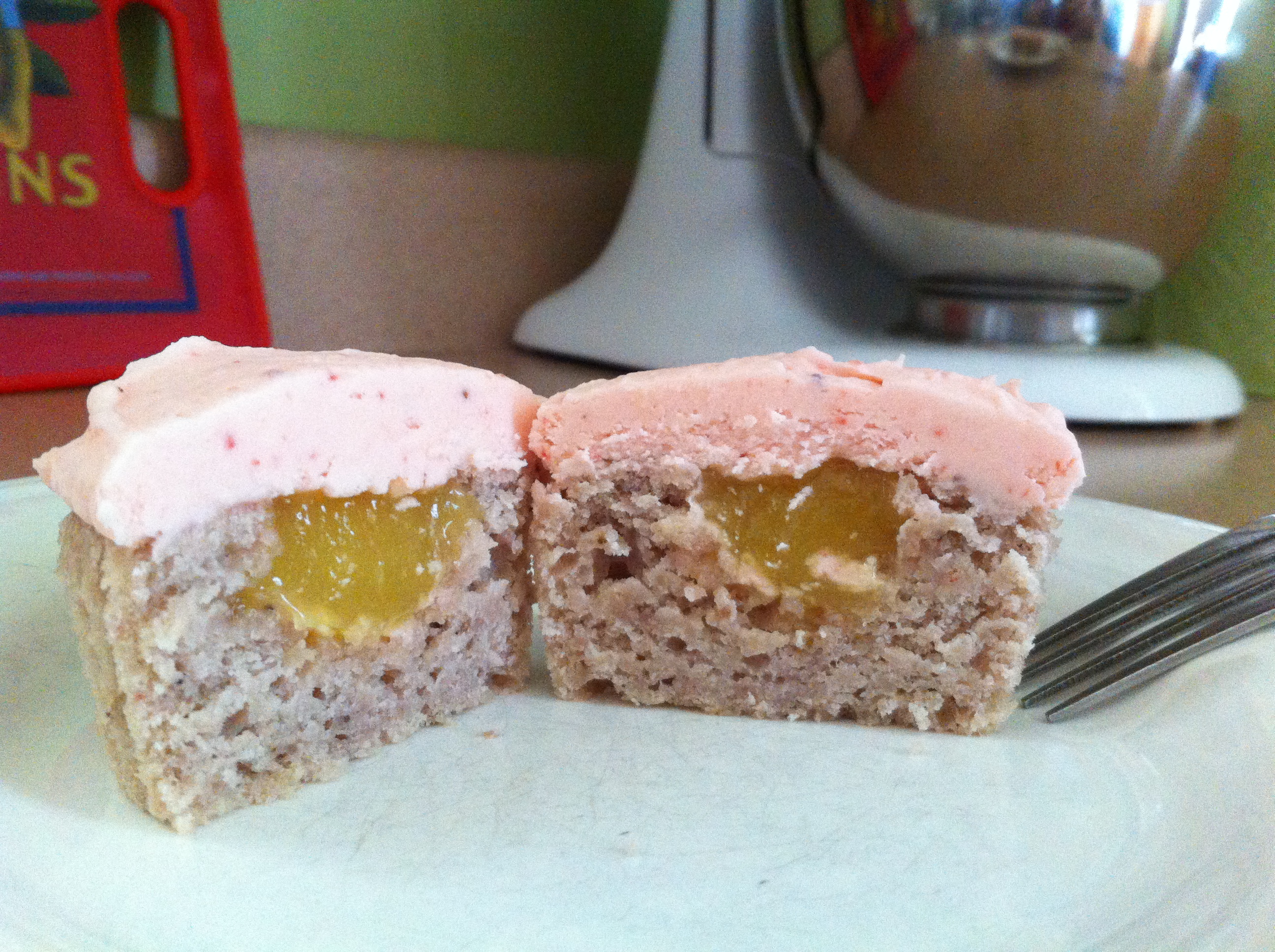 Using the small end of a melon baller, scoop out a small amount of cake from the center of each cupcake; fill with lemon curd (a half-teaspoon measuring spoon works well for filling if you don’t want to use a piping bag). Frost with fresh strawberry buttercream; store cupcakes in the refrigerator for up to 3 days.