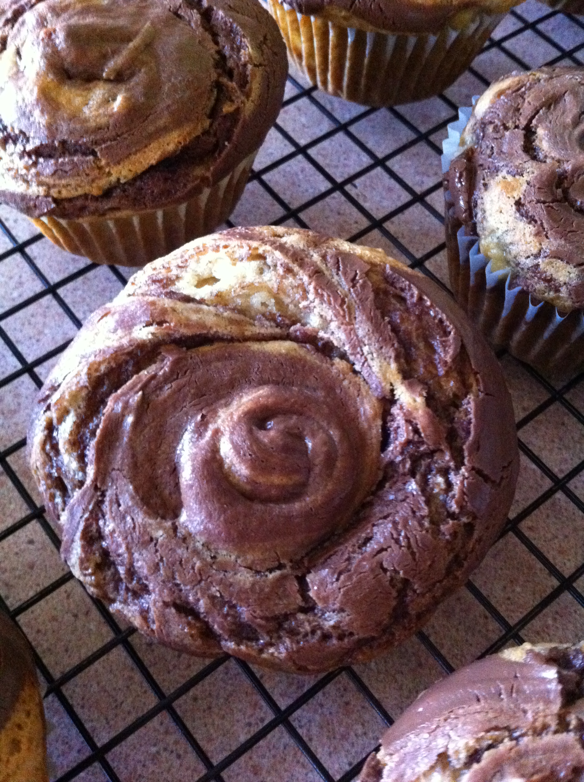 In a microwave-safe bowl, microwave Nutella in 15-second intervals until thinned and easy to stir. Using a tablespoon from your flatware, drop dollops of Nutella onto the top of each muffin and swirl with a toothpick to spread; I used about 1 tablespoon on each.