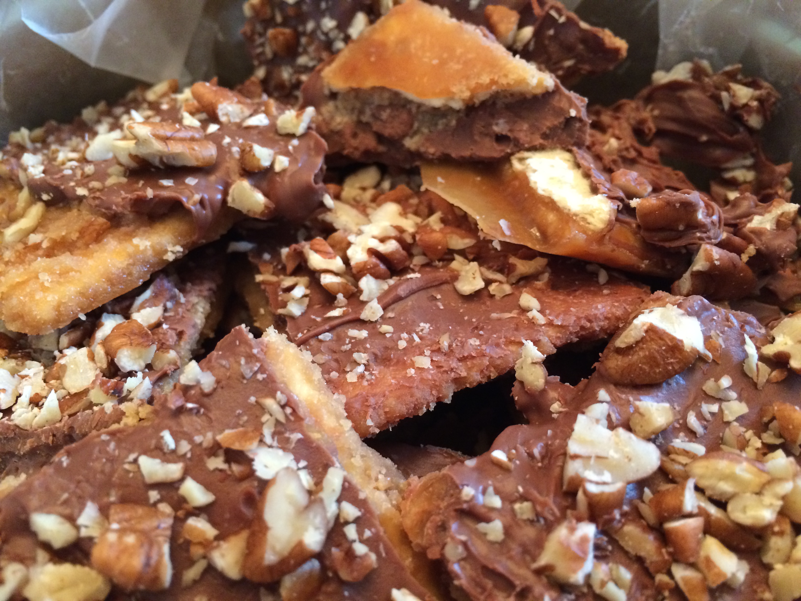 Sweet SaltinesRecipes for this treat – which has various names, including “Christmas Crack” – are everywhere. My Aunt Liz makes a version that she calls pecan pralines, involving graham crackers, toffee, and pecans. I didn’t have enough graham crackers to make that version, so I’ve used the standard saltine instead.