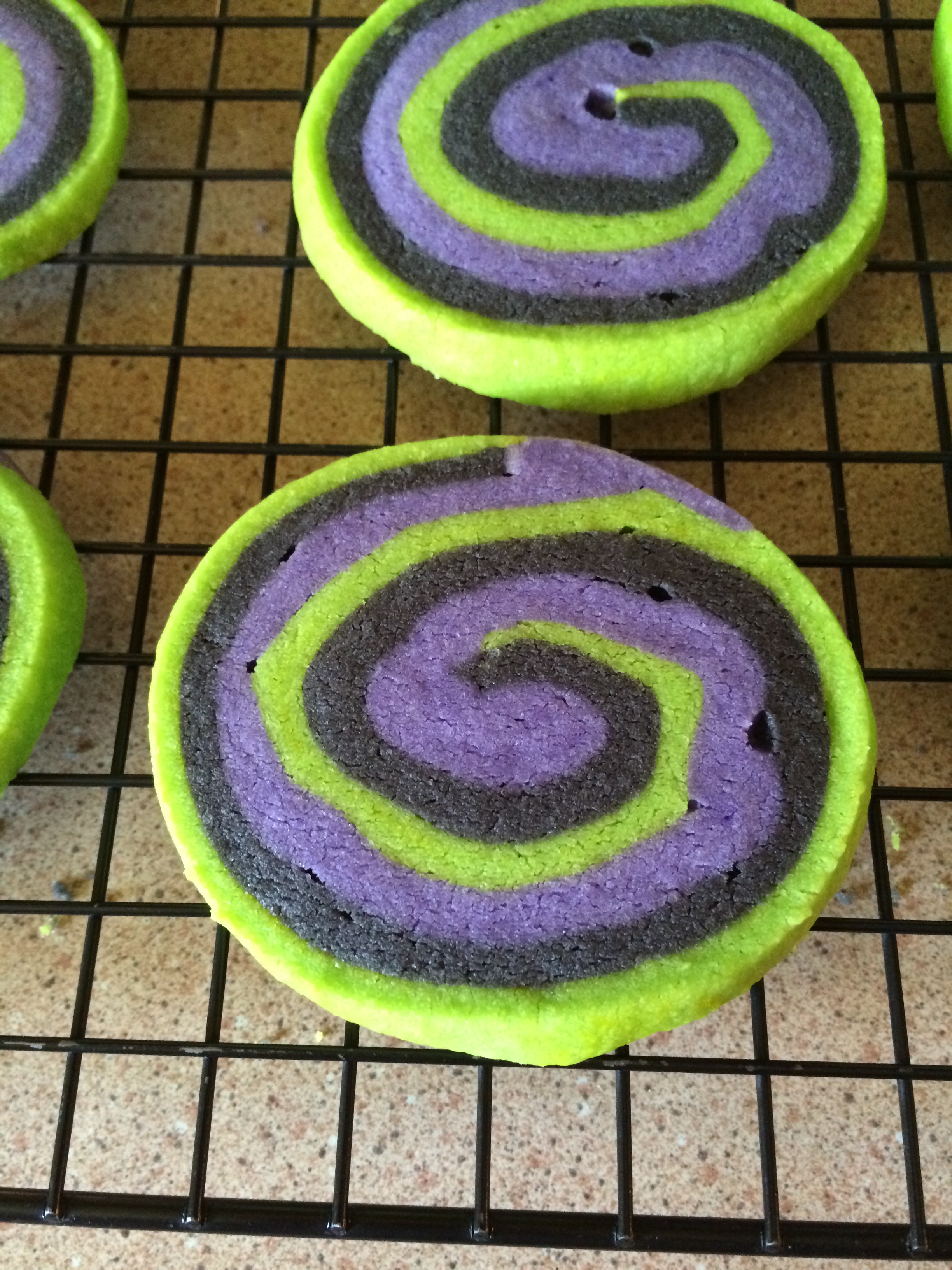 A word about spiral cookies: it’s very important to press your layers together firmly as you roll your dough log to avoid the small gaps you can see in the cookie here. This dough is very soft when rolled out, so waxed paper helps in handling a great deal. I found the original recipe for these over at Lady Behind the Curtain and chose not to roll the dough log in sprinkles before I sliced them, but that would definitely add an extra spooky kick (and some nice crunch) to these treats.