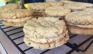 My King Arthur Flour Cookie Companion is now such a cookbook, its pages warping with good use. Today’s scout’s honor peanut butter sandwich cookies come from the peanut butter chapter, a wonderful collection of classic peanut butter cookies and delicious adaptations. These treats are a home-baked version of Girl Scout peanut butter sandwich cookies, and this recipe yields hearty, peanut buttery treats with a delightful mellow flavor and great texture from the rolled oats that get mixed into the dough. These would also be delicious with a chocolate filling, but the classic peanut butter – which I adapted to include some vanilla extract – is just perfect.