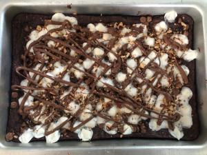 Spread batter in the pan; I used an offset spatula to create an even layer. Bake for 15 minutes, until sides are set and middle is still soft. Sprinkle with miniature marshmallows and 1 cup of the chocolate chips. Bake for another 4 minutes, until marshmallows are just beginning to brown.