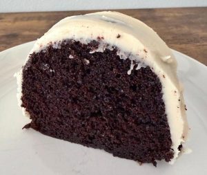Pour wet ingredients into dry ingredients and mix with a spatula until the batter comes together, then whisk to fully combine so that no lumps remain; the batter is fairly thin. Pour into prepared Bundt pan and bake for 40 – 50 minutes or until a cake tester comes out clean or with just a few moist crumbs (mine needed about 42 minutes). Cool in the pan for about 15 minutes, then invert onto a wire rack to cool completely; I place parchment on my wire rack to help support the cake and avoid that mesh pattern in the bottom as it cools. Cool completely before frosting.