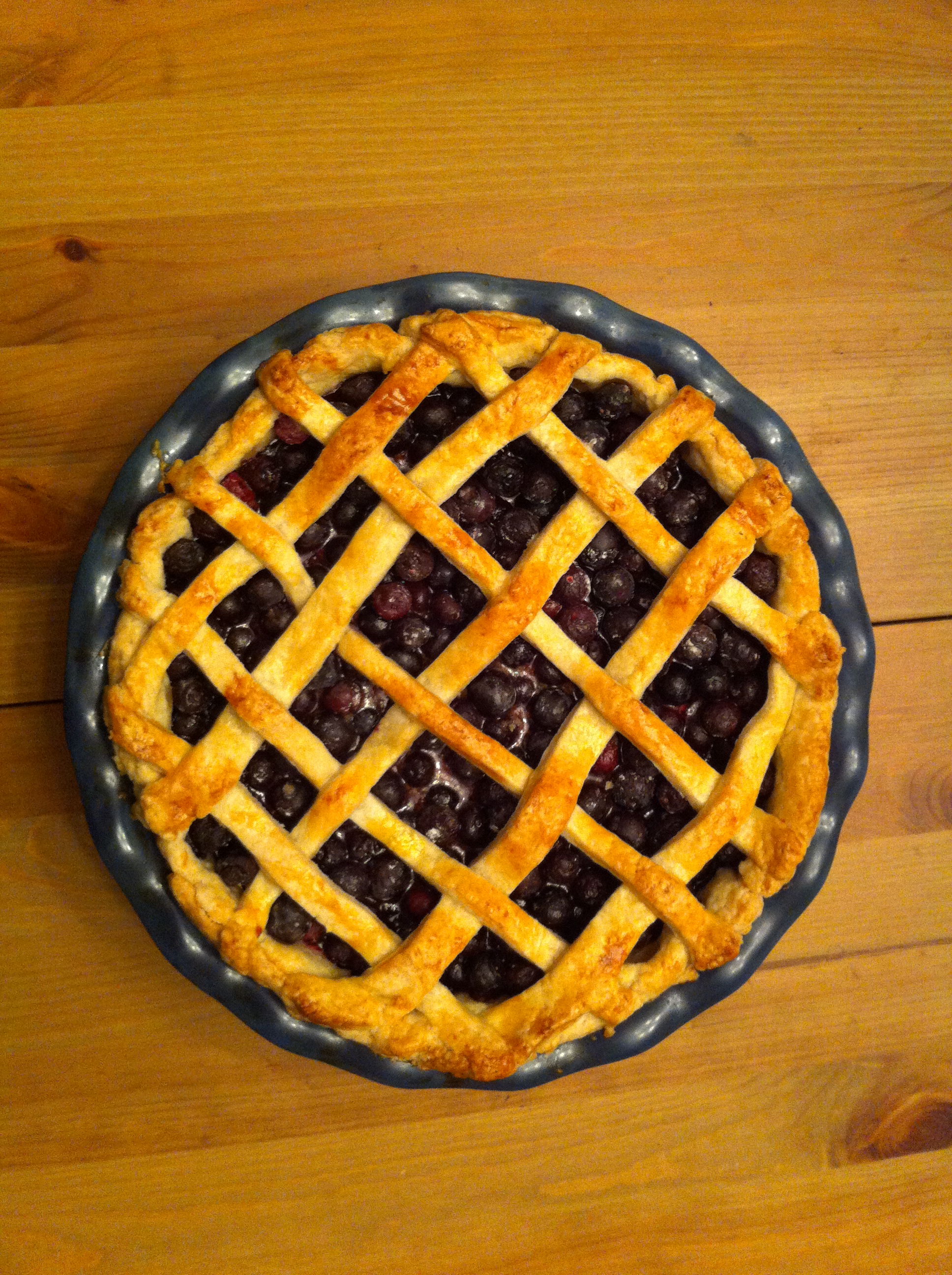 One of summer’s great fruits is the blueberry, a delicious superfood packed with manganese, vitamin C, vitamin K, and fiber. I’ll concede that blueberries are probably better eaten when not in pie form, but Mike requested a blueberry pie this weekend, so there you have it. I sought a recipe that used his preferred whole berries, not a pureed-type recipe, and found one that I have to admit has some flaws.