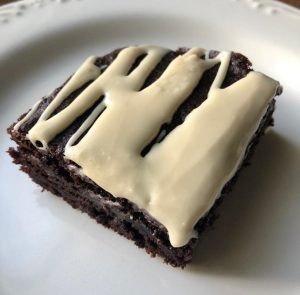 Pinterest bills these treats as a vintage, 1950s recipe called “lunch lady brownies.” I guess a talented cafeteria worker whipped them up decades ago and passed the recipe down…and I’m glad she did. I found the full recipe at Spaceships and Laser Beams, which isn’t exactly the brand I’d associate with a food blog, but whatever works for you. I altered the preparation steps because I feel like the original didn’t quite make sense, so I’ve gone with a method I’ve used for other brownies before and it turned out well.