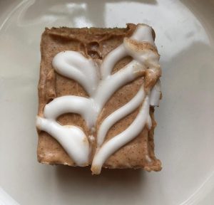 Remove from oven and cool on a rack for 1 hour, then chill until completely set. Once set, make your first layer of icing; in a medium bowl, combine 2 cups powdered sugar, 2 teaspoons cinnamon, and 1/2 teaspoon salt. Add heavy cream 1 tablespoon at a time, until you reach a spreadable consistency that’s still slightly firm. Spread on bars, smoothing as much as possible.