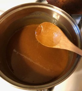 Allow mixture to cook to dissolve the sugar; it will look cloudy (step 1). Once the sugar dissolves completely, allow the mixture to cook on medium-high until it turns an amber color, which can take 5-10 minutes; mine began to turn amber around 6 minutes into cooking and I gently shifted my pan a bit to keep the heat even as the mixture began to darken (step 2). When the mixture is almost evenly browned (step 3 – I pulled mine when all but the very center of my mixture had turned amber), remove from heat. Very carefully add heavy cream, stirring well, then add butter and continue to stir until completely smooth (step 4). The mixture will bubble up when the cold cream hits the hot sugar mixture, so watch out for splashes and be careful not to get burned.