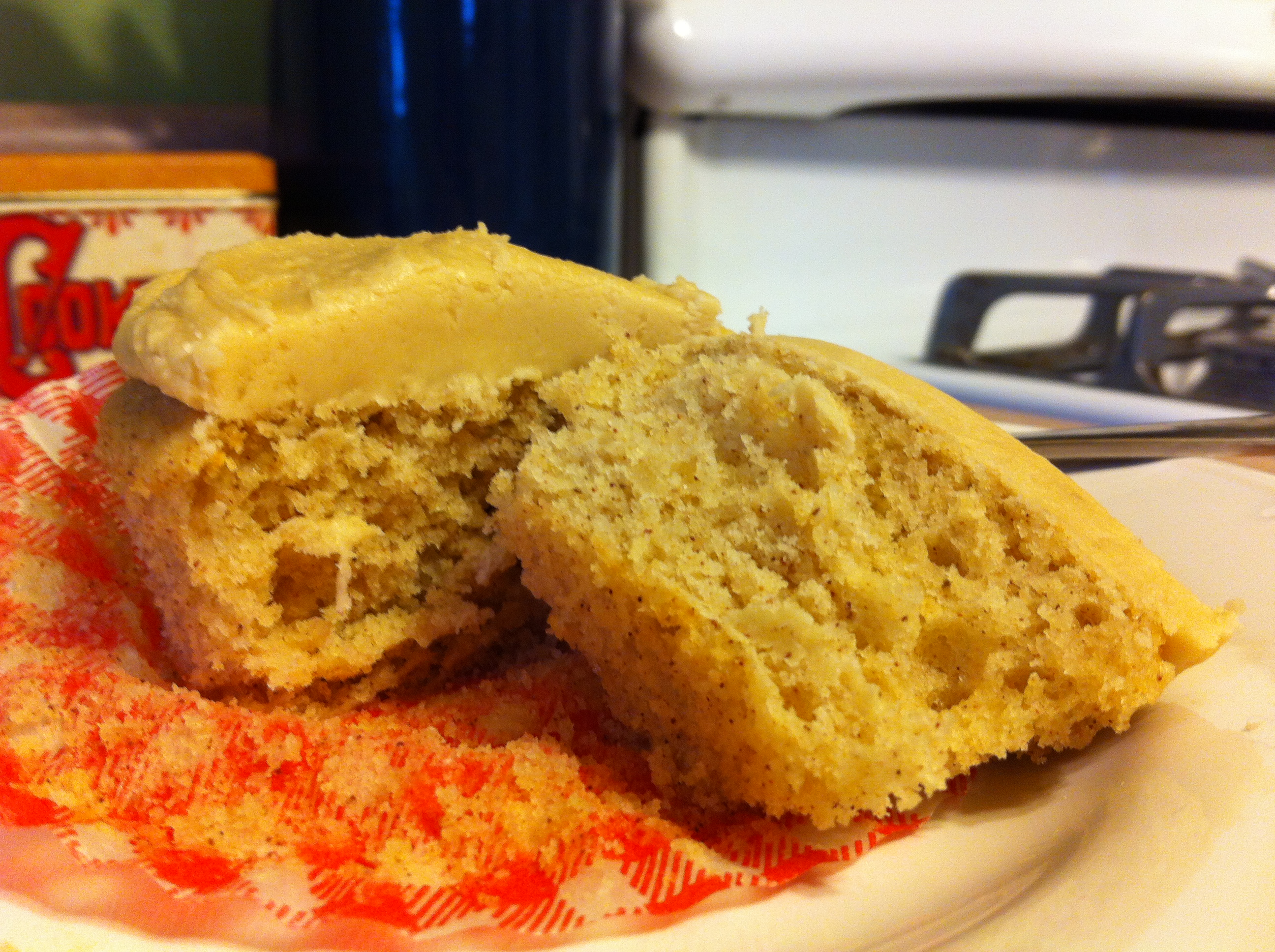 These cupcakes pair well with maple cream cheese frosting, which is one of my favorites ever. Just make sure you use real maple syrup – the pure stuff – rather than maple flavoring for this frosting; while you could probably use maple flavoring, I doubt it would be the same. If you’re lacking in pure maple syrup, you could certainly frost these with plain cream cheese frosting or cinnamon cream cheese frosting.