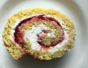 Swiss roll is another term for jelly roll; it’s a sponge-type cake with jam, preserves, buttercream, pudding, or a combination of fillings. I made a “plain” vanilla cake/strawberry preserves jelly roll earlier this summer and decided to branch out to a lemon, almond, and raspberry creation. I had some extra raspberry sauce that I served on the side of each slice; you could also garnish with fresh berries if you like.
