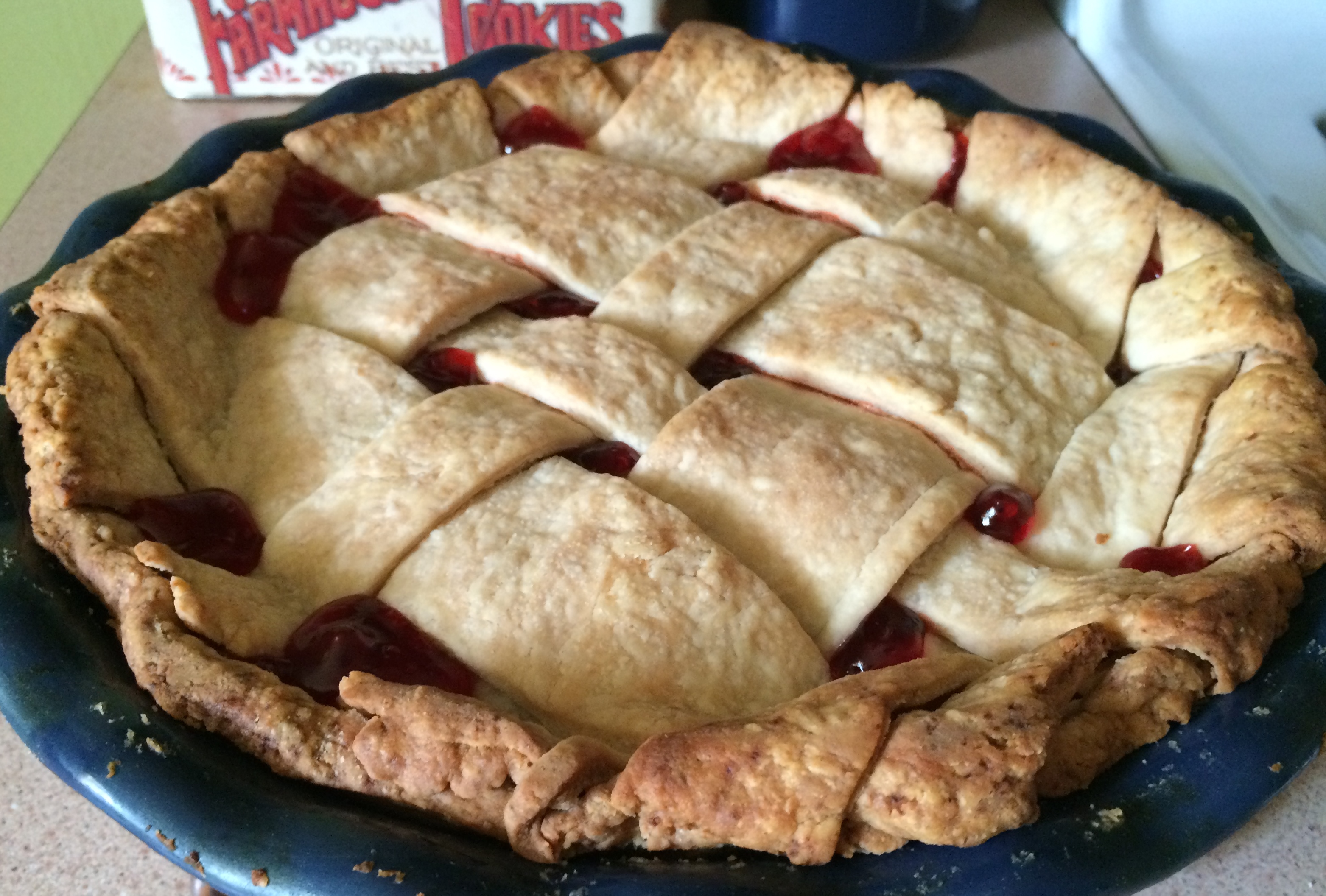 Measure out 1/4 cup of water and add ice; stir, then pour out 1/4 cup to use in your dough. Drizzle into flour mixture 1 tablespoon at a time, stirring with a spatula after each addition. Stop adding water when the dough starts to form large clumps. Transfer to a floured work surface and flour your hands, then fold the dough into itself to fully incorporate the butter and shortening into the dry mixture. Be gentle – pastry doesn’t like to be handled too much or it gets tough. Flatten into a disc, cover in plastic wrap, and chill for at least 2 hours.