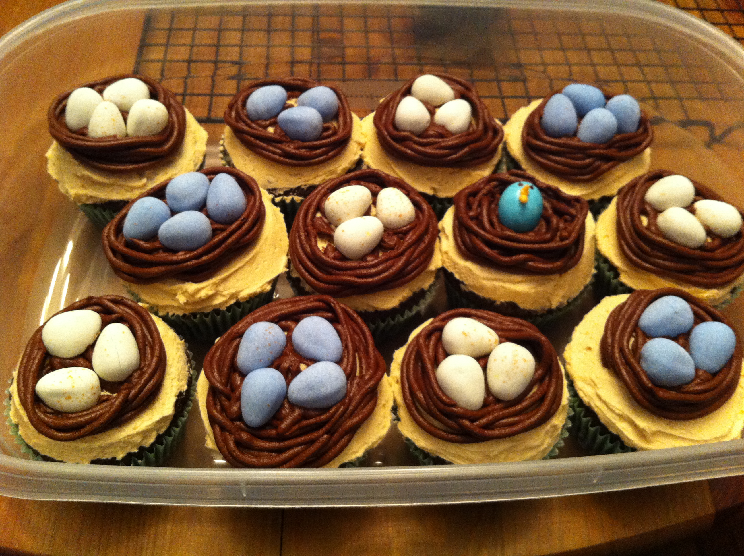 Divide frosting into three equal portions; tint each a pastel shade of blue, green, and yellow.