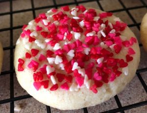 Roll dough to 1/8 inch thickness and cut into heart shapes, then press the tops of each cookie into the sugar to coat. Place on baking sheets about 1-2 inches apart – they don’t spread much when baking, but you don’t want to crowd your baking sheets.